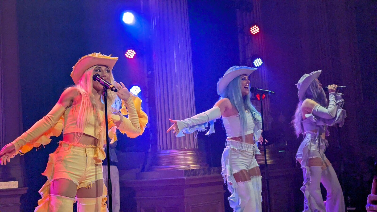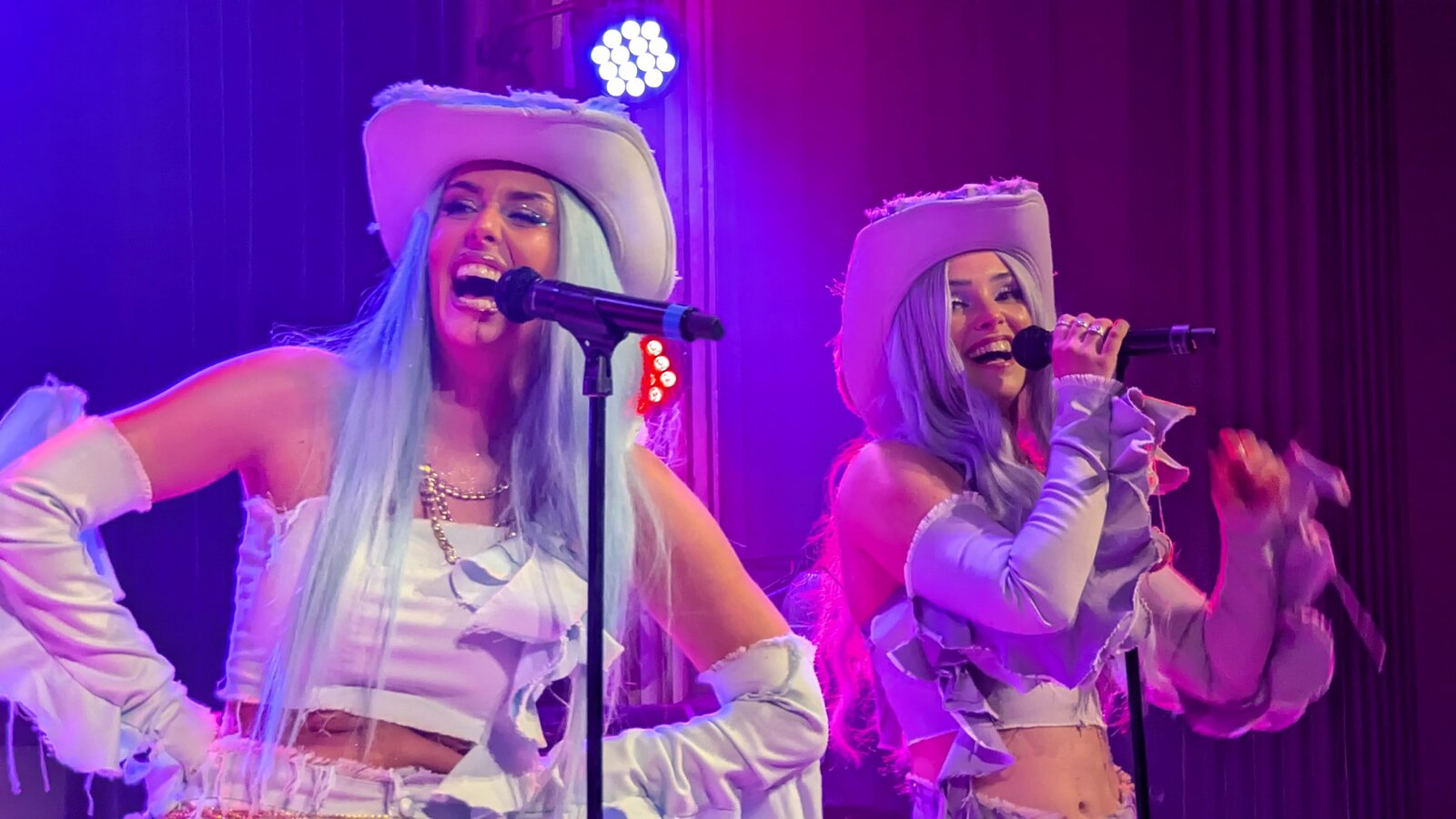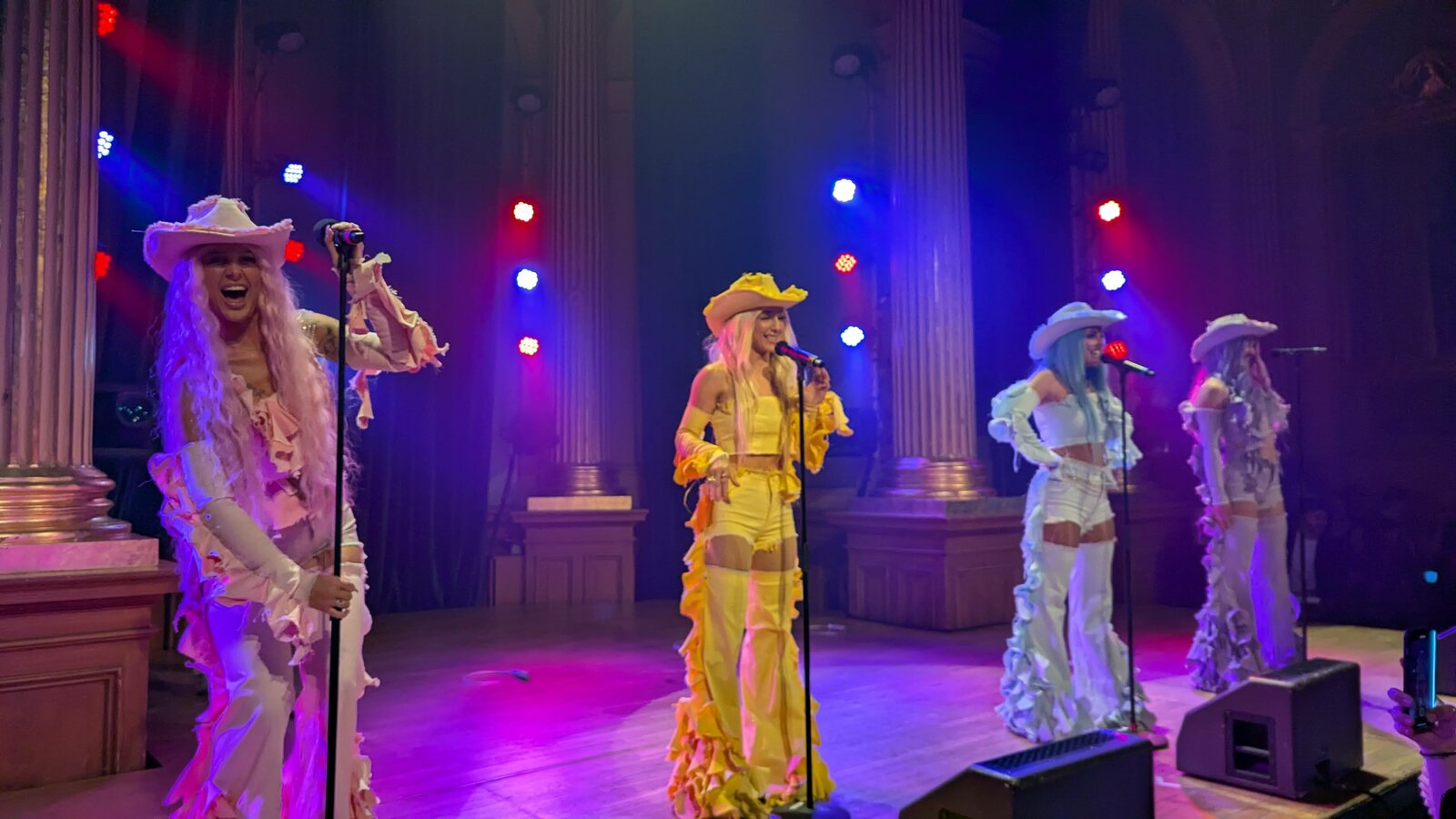 Dans un tout autre registre, qui plaît vraisemblablement plus aux eurofans qui ont répondu présent encore ce soir, ceux sont les Dolly Style que nous accueillons. D’abord pour "Habibi" (leur classique avec lequel elles ont tenté leur chance au Melodifestivalen 2019), un titre récent, "Confetti" (Clap your hands) sorti en 2025, puis le morceau avec lequel elles sont allées en finale au Mello 2025 : "Yihaa", grand succès dans l’assemblée. Les chanteuses incarnent les personnages de Holly, Molly, Polly et Yolly, grimées en tenues pastels.