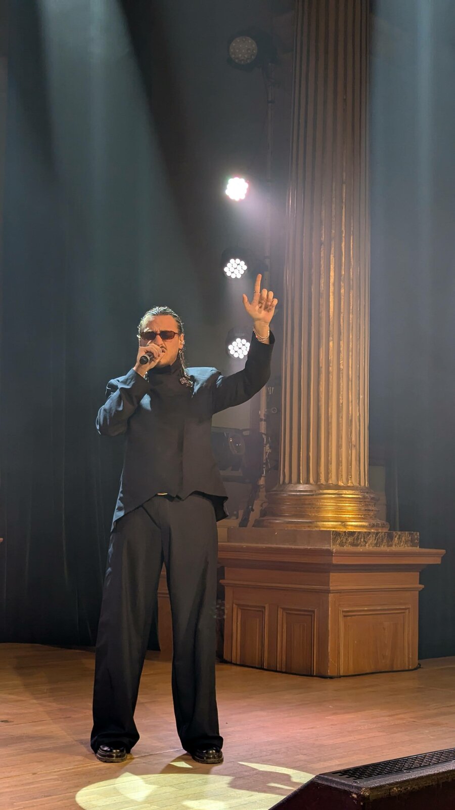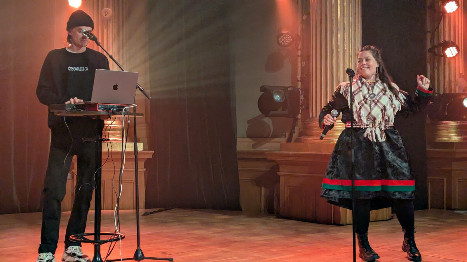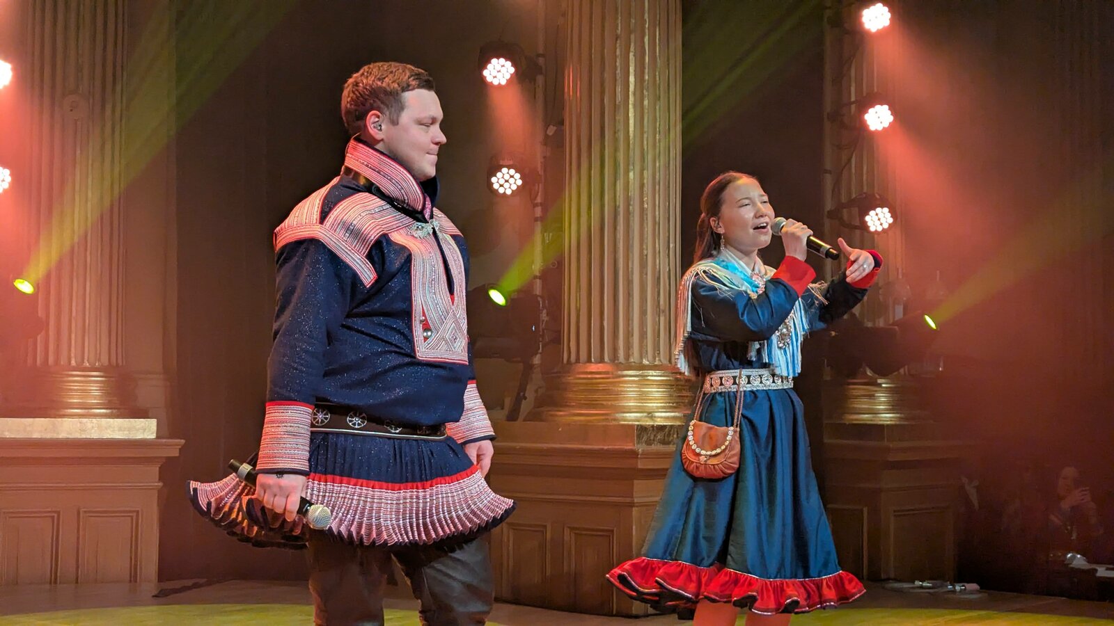 Un duo sami est appelé sur scène. Piera Eira et Maija, vainqueurs du Sami Grand Prix 2025, l’ont emporté avec "Dálkkiid čađa", un morceau dance qu’ils nous interprètent ce soir.