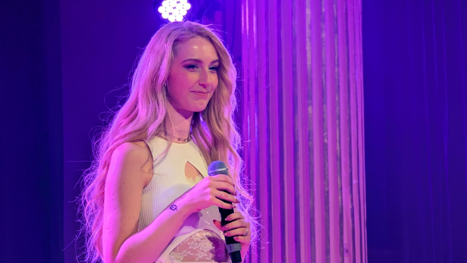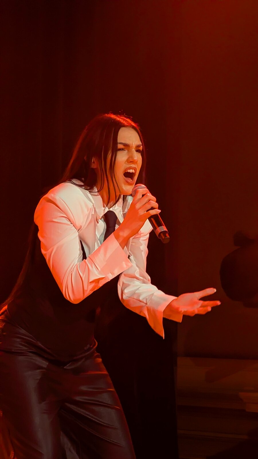 Jacqline, en tenue noire très sexy, interprète d’abord "Woman" (Mello 2026), puis l’excellent "Effortless" (Mello 2024). Féline et charismatique, l’artiste dégage une véritable sensualité et se déhanche avec assurance.