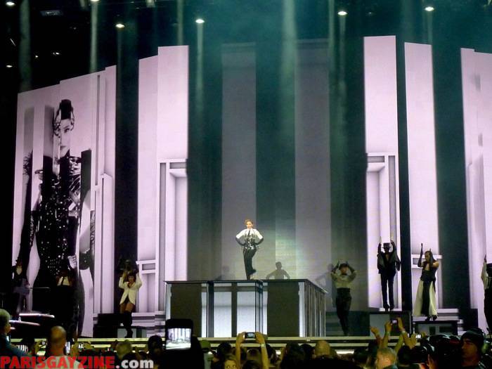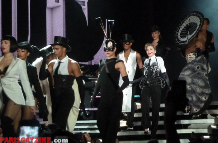 Le tableau Masculin/Féminin prend forme ensuite avec les costumes de Jean-Paul Gaultier. C’est un vrai défilé aux couleurs blanches et noires que portent aussi Madonna. Son bustier est inspiré du travail du couturier français pour la madonne dans les années 90. Jean-Paul présent dans la zone VIP peut juger son travail de plus près.