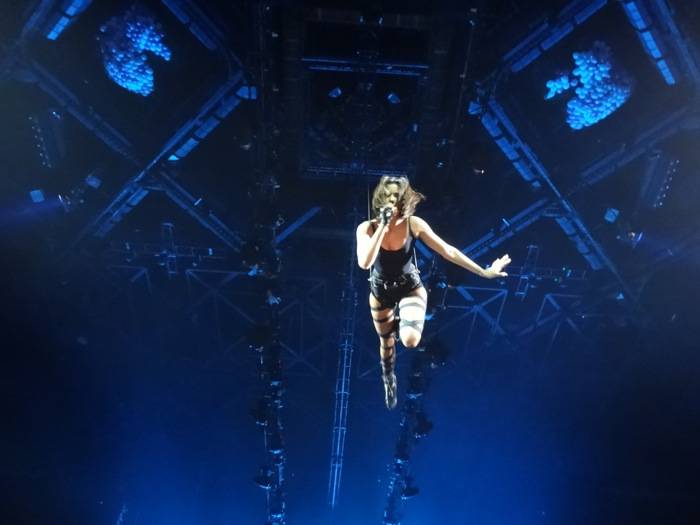 21 heures. Plusieurs danseuses chevauchent les lettres S.H.Y.M. La star descend simplement par les airs sur la chanson Ma peur. Et c’est peut être pour combler cette peur que cela commence en douceur sur des lumières éblouissantes et une guitare électrique très présente sur cette ouverture.