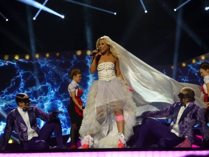 Sa prestation à Malmö ressemble trait pour trait à ce qu'on avait vu sur YouTube. Elle est toujours aussi sensuelle dans sa longue robe blanche, moulante, futuriste.