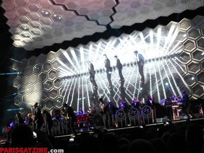 21 heures. Le show commence vraiment avec l’arrivée de Justin Timberlake qui chante Pusher love girl a cappella. En nœud de papillon et smoking Tom Ford, seul dans un premier temps, la star américaine est très vite rejointe par sa troupe de musiciens et de choristes. Une vingtaine de personnes sont sur scène à ses côtés, derrière leurs instruments pour les uns ou derrière leurs pupitres aux initiales JT pour les autres. Sans oublier les quelques danseurs.