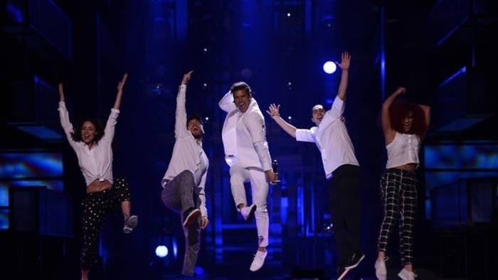 C’est bien sûr pour un morceau dansant que le jeune de 24 ans a opté. Il n’a pas cédé à la mode électro mais ce titre reste fédérateur avec ses sonorités cuivrées, un peu funky, bien revisitées avec plus d’instruments de studio. La prestation est très bien chorégraphiée, dynamique et cela swing. Eric monte sur une nacelle ronde pour le final explosif avec une pluie de confettis dorés.