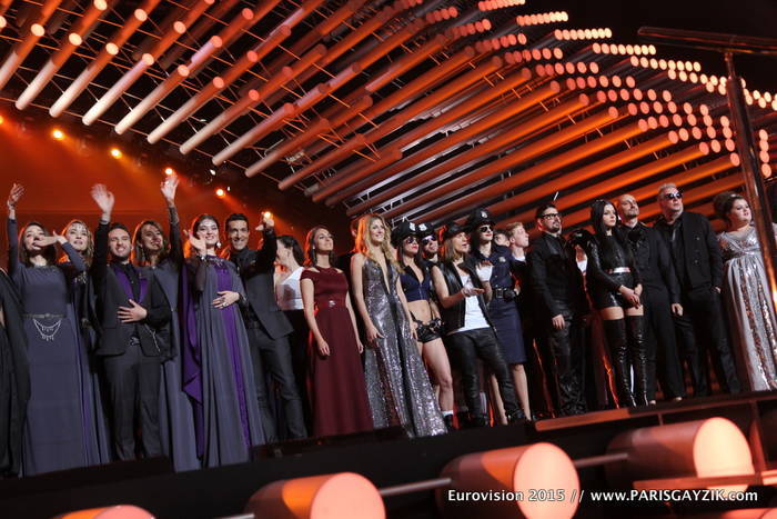 C'est la grande gagnante autrichienne Conchita Wurst qui ouvre cet Eurovision 2015 avec son titre "Rise like a phoenix". Une mise en scène vibrante avec notamment un orchestre live, un hommage à cette chanson qui a marqué l'année 2014 et qui a permis à l'Autriche de remporter le trophée. La star emprunte la grande allée centrale pour rejoindre la green room où patientent les artistes en compétition. La diva reprend le dernier refrain de sa chanson et souhaite la bienvenue à l'Europe tout entière. Elle donne la parole au trio d'animatrices de la soirée, superbes, chacune dans une tonalité verte. Elles souhaitent la bienvenue à l'Australie et présentent aux téléspectateurs le déroulé de la soirée.