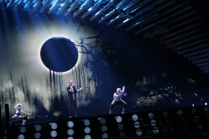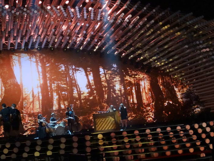 La voix de la chanteuse portugaise est bien en place. Son morceau est plus rock que nous ne le pensions mais cela reste faiblard pour que nous adhérions vraiment. Elle est venue avec ses quatre choristes et porte une combinaison noire en latex et des voiles de la même couleur. Un look classique revisité. Là encore, il ne se passe pas grand chose sur scène. Le visuel et les éclairages sont cependant agréables.