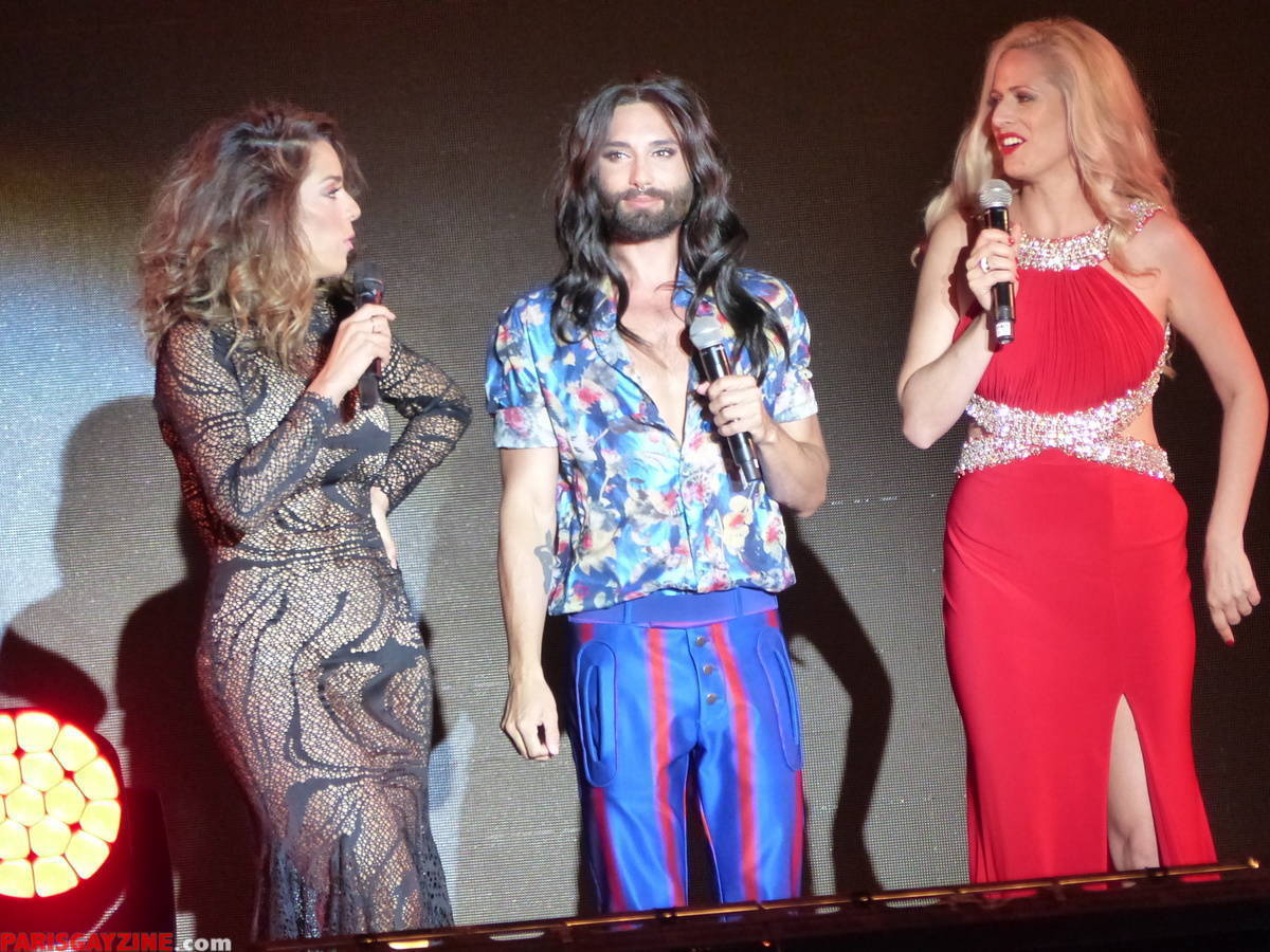 Conchita arbore un look décontracté avec sa chemise fleurie aux bandes rouges et son pantalon bleu. Elle s’exprime quelques instants notamment au sujet de l’égalité et adresse aux antis un "What’s your f***k problem ?!?"