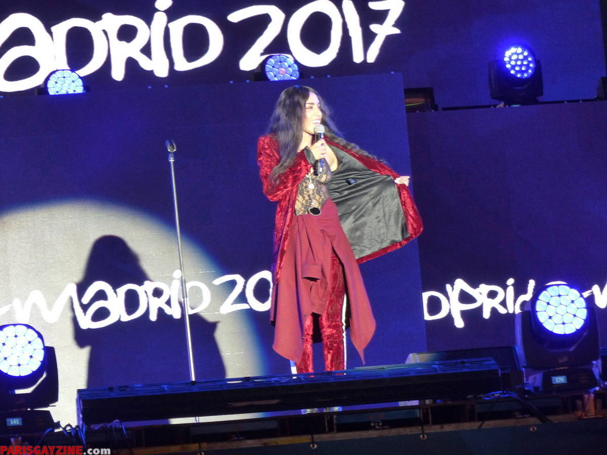 Samedi 1er juillet 2017. Juste après la parade de la LGBT World Pride, nous nous rendons à nouveau à Puerta de Alcala pour cette seconde soirée. Un plateau d’artistes Eurovision est organisé. Le concept est le même que la veille mais avec d’autres présentateurs… et des stars de l’Eurovision (Loreen, Conchita Wurst…) !