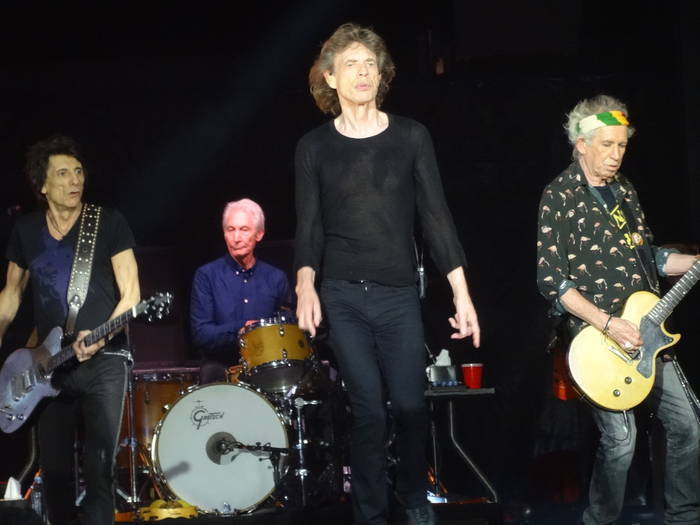 Le leader présente ensuite ses complices de longue durée, les guitaristes Keith Richards et Ron Wood, ainsi que le (discret) batteur du groupe, Charlie Watts. Jagger met ce dernier en avant en l’extirpant de ses caisses et cymbales pour l’inviter à nous montrer ses élégantes chaussures, la classe britannique !