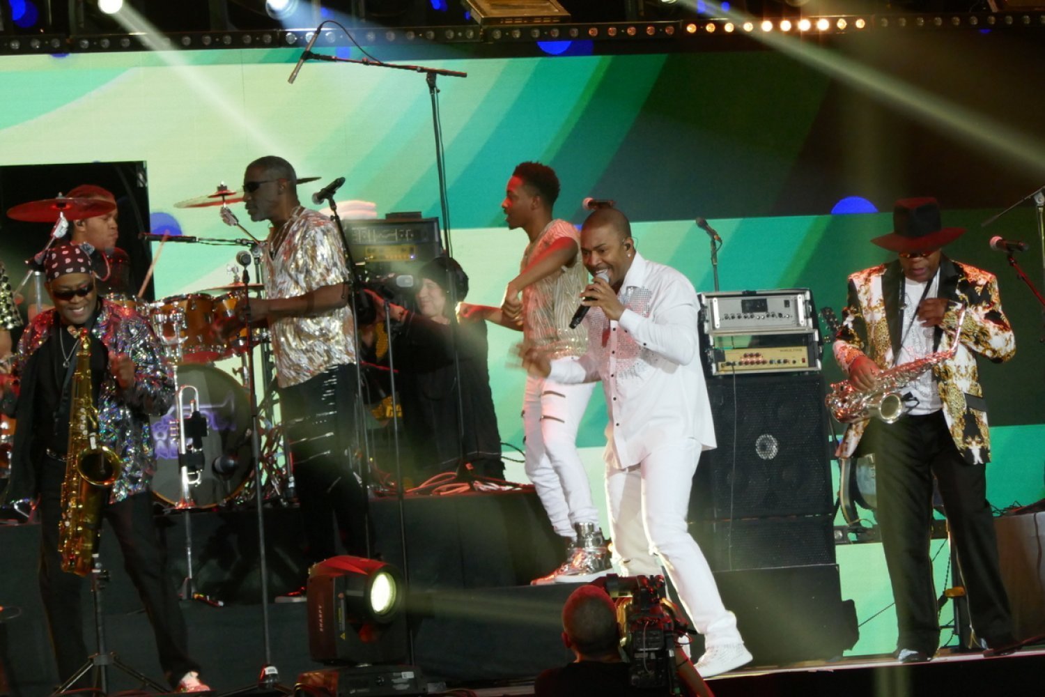 Gilbert Montagné chante ensuite avec eux sur "Celebration". Juste avant, il a eu un moment de solitude avec deux micros mais heureusement l'un des Kool lui vient en aide.