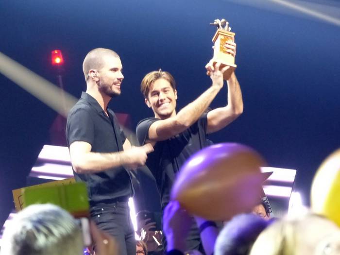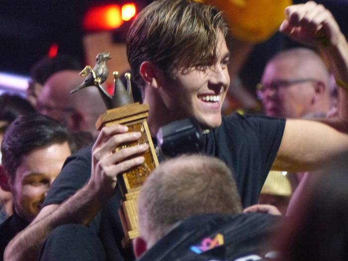 Il explose de joie et vient rejoindre la scène principale où il reçoit le trophée du Melodifestivalen et un bouquet de fleurs sous les flashs de nombreux photographes.
