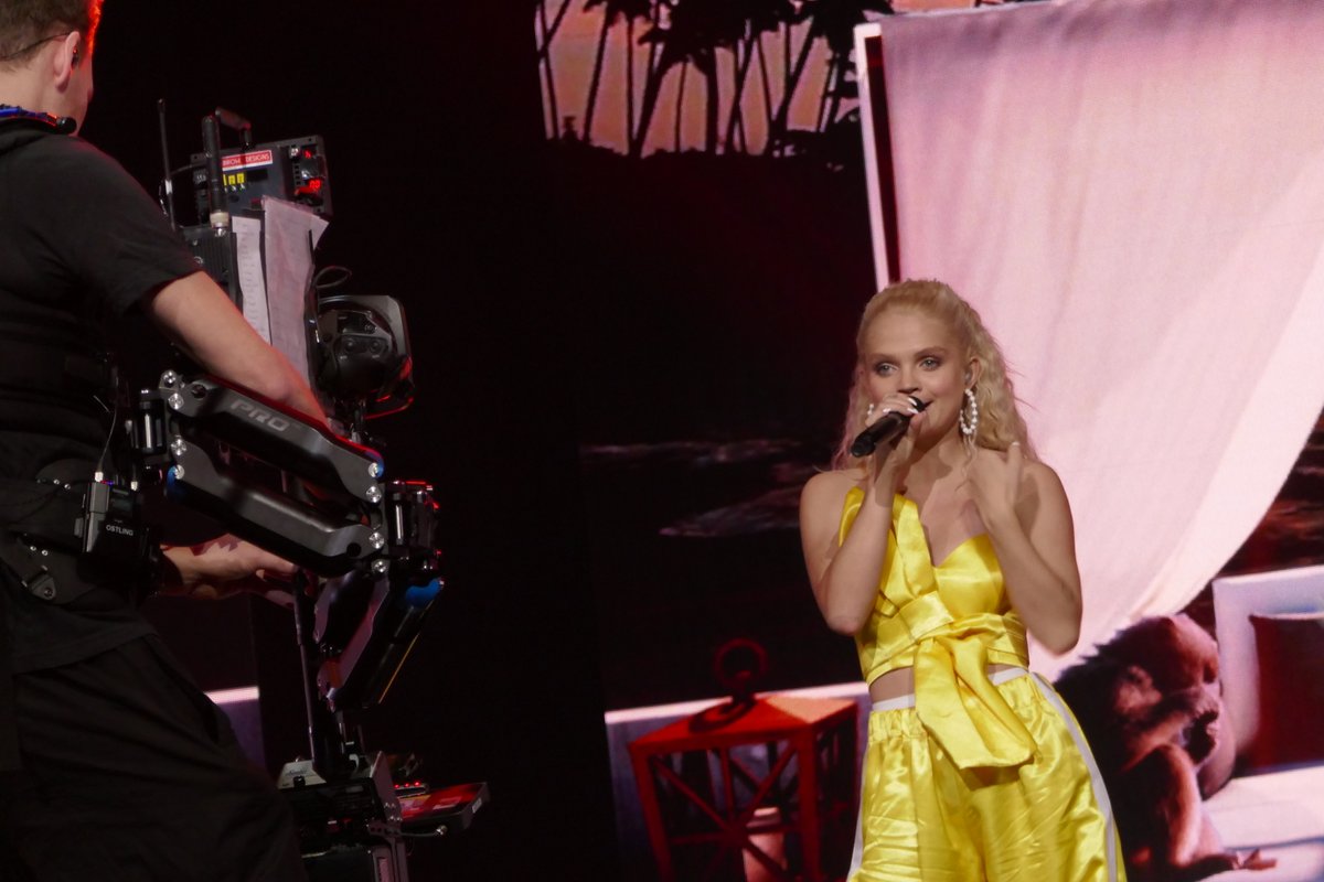 Après avoir porté du noir lors de la première émission, du bleu jeans lors de la seconde chance, la jeune femme porte ce soir, pour la finale, une robe orangée avec un grand corset noir à la taille. La Beyoncé suédoise est gênée par son oreillette et tente de le faire comprendre à l’équipe technique sans toutefois s’interrompre.