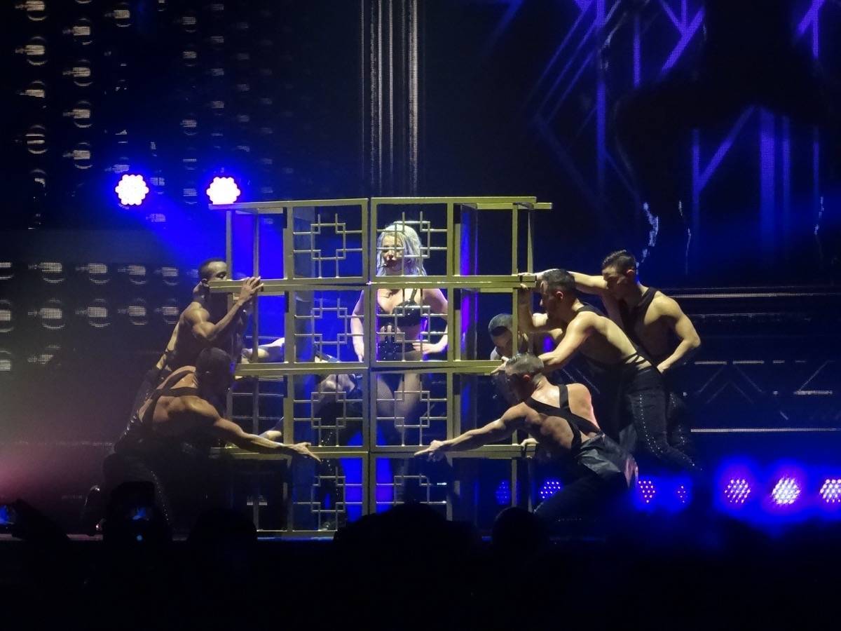 Le show se poursuit, aussi fort et plein de dynamisme, avec "Womanizer" sur lequel elle est entourée de ses danseurs aux vestes militaires et ouvertes, et de ses danseuses en tenues noires, jusqu’à l’extrémité de l’avant-scène. Elle marche ensuite sur ses hommes musclés qui la portent enfin à bout de bras.