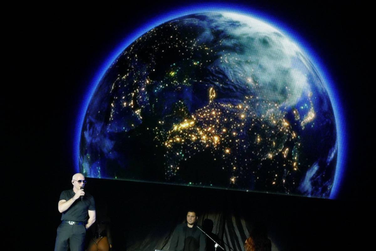 C'est à 20h05 que commence la première partie de Pitbull. Dans le petit film diffusé, l’artiste américain, un poil mégalo, affiche ses talents-ambitions : entrepreneur, visionnaire, coach en motivation, businessman et éducateur. Il se présente sous le nom de Mr. Worldwide, et se fait aussi appeler Mr. 305 (305 étant l'identifiant de la ville de Miami), tandis que son nom à l’état civil est Armando Christian Pérez.