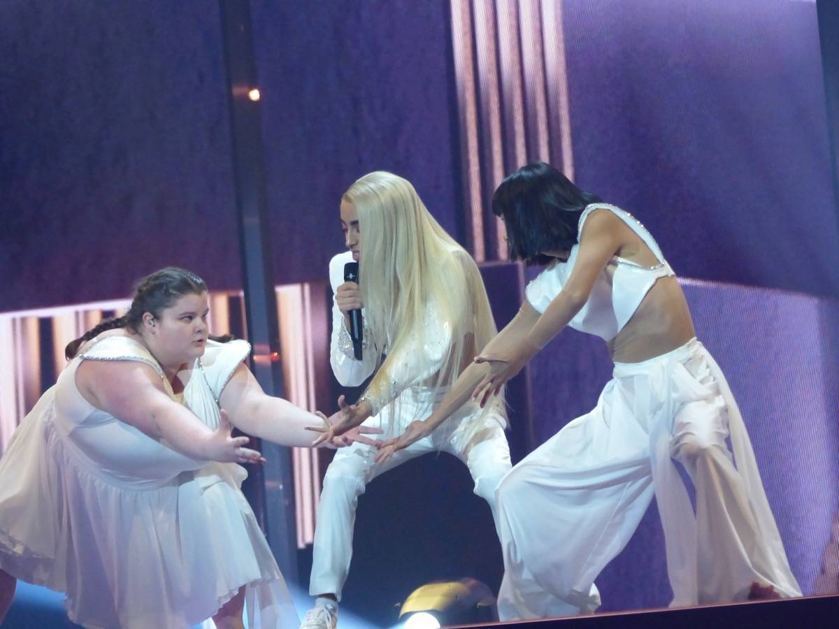 Sa performance débute par un gros plan sur son visage, sur lequel est projeté tout son imaginaire, dont les inscriptions "Roi" et "Voguing". Des larmes colorées apparaissent également. Il s'agit d'un effet de mapping facial qui semble-t-il n'avait jamais encore été utilisé à l'Eurovision. Des améliorations vont y être apportées car l'effet n'était pas très agréable à l'écran.