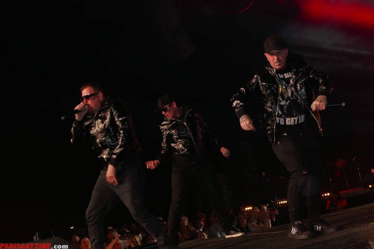 "Been around the world" est un mid tempo puis la jolie ballade "Stay another day" pendant laquelle les trois E17 se déplacent ensemble sur chaque côté de la scène. L'occasion pour nous de les voir de plus près, et notamment le dernier membre à figurer au line up et qui est, plutôt qu'un chanteur, un spécialiste en coucous et autres coeurs dessinés à merveille avec ses mains.